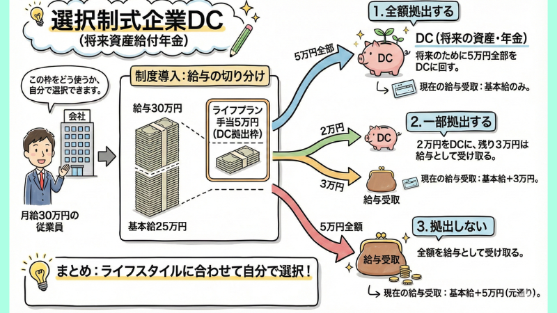 会社は、その給与のうち例えば5万円分を「ライフプラン手当(DC拠出枠)」として切り分けます。